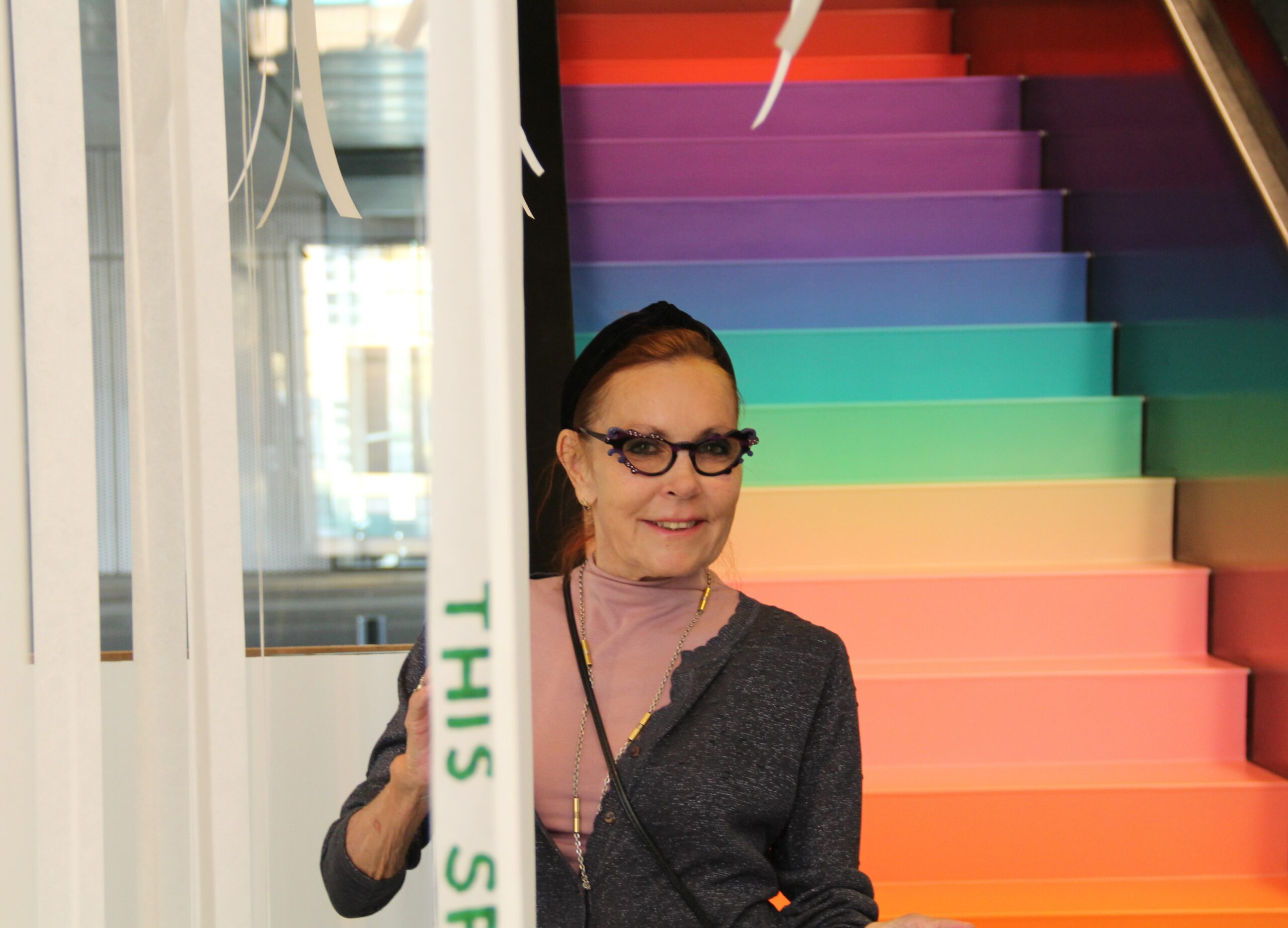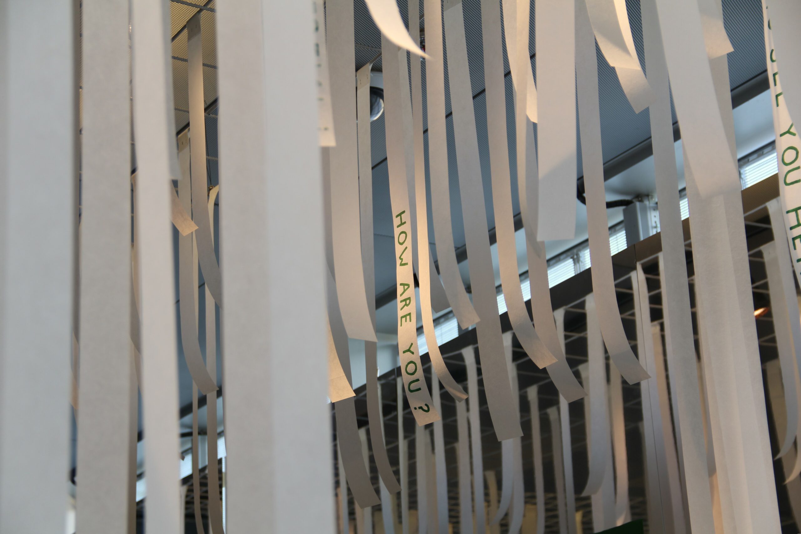 Udstillingen er opdelt i 5 afsnit. I det første rum for enden af regnbuetrappen, er det mødet med os selv. En masse hvide strimler hænger ned fra loftet med små citater. Du kan bevæge dig ind imellem dem. Der står f.eks. ’Du gør dette sted vigtigt’ – ’Er du tilstede’? – ’Din tilstedeværelse skaber atmosfære’ – ’Dejligt at se dig her’- eller et med ’Hvordan har du det’? Små hints til at starte en kommunikation. Vi var en del mennesker deroppe samtidigt og det var sjovt, for folk talte faktisk sammen.
