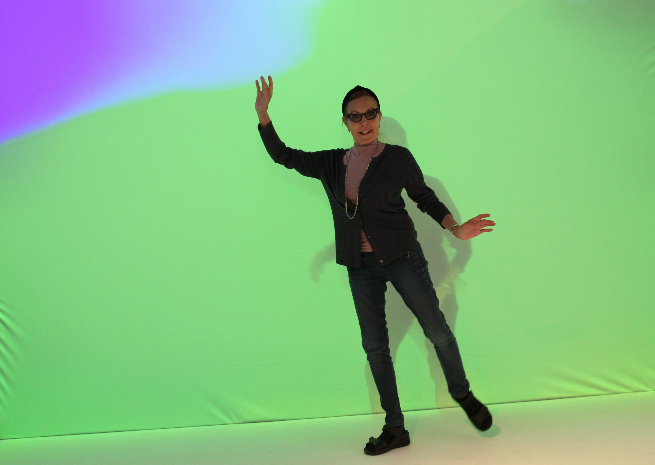 I det fjerde rum mødes den digitale og fysiske verden. Det er kropslig nærvær, når du springer rundt på et lille podie og regnbuens farver spiller rundt på din krop.