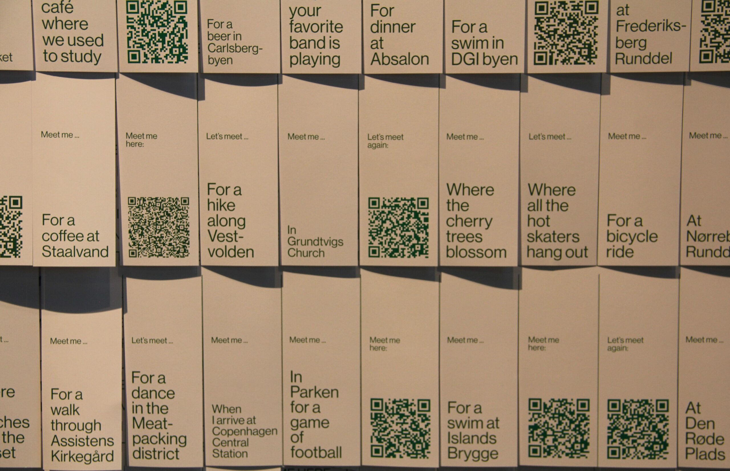 Det sidste rum er en opfordring til at mødes ude i byen. På en hel væg er opsat små sedler og det er meningen du skal tage en og gå hen til det sted der står, eller gøre noget der er på sedlen. Sedlerne er både med QR koder og analoge. Det er meningen at du med sedlen i hånden skal gå en tur i København. Tænk nu hvis du mødte en anden, også med en seddel i hånden? Der var sandelig noget at tale om.
