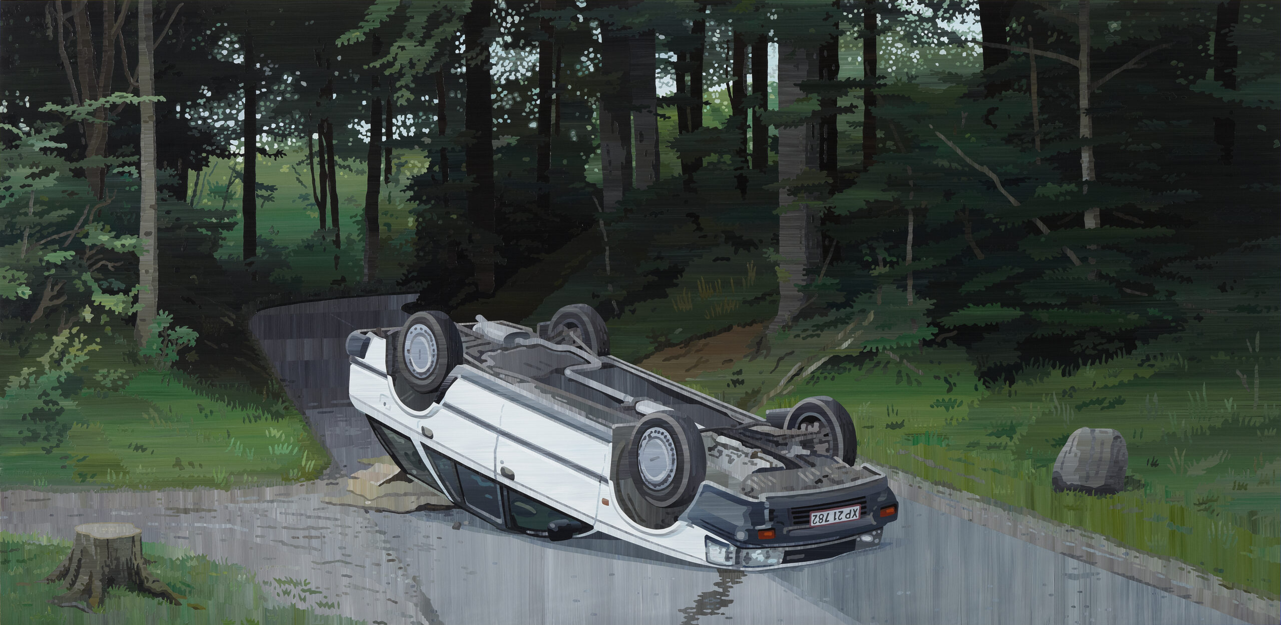 Otte har malet en bil i en skov. Den ligger på taget i en skovlysning. Med Ottes vanlige sans for at få os til at se nærmere på tingene, og forstå dem på en anden måde, ser vi på bilen og forundres over, hvad den laver på sådan et idyllisk sted Er den blevet smidt som skråt, den kunne være forulykket, eller måske noget helt tredje.
