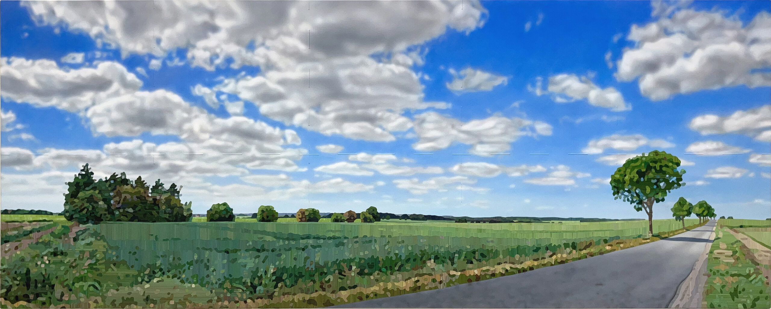 Ved siden af hænger et landskabsbillede af Ulrik Møller og du fornemmer straks den friske luft og højt til himlen, du er er ude på landet i Danmark. Hans farver giver et blødt og indbydende indtryk, du har lyst til at træde ind i billedet. Hans tilgang til landskabsmaleriet er lidt altmodisch. Du bliver indfanget af den landlige stemning.