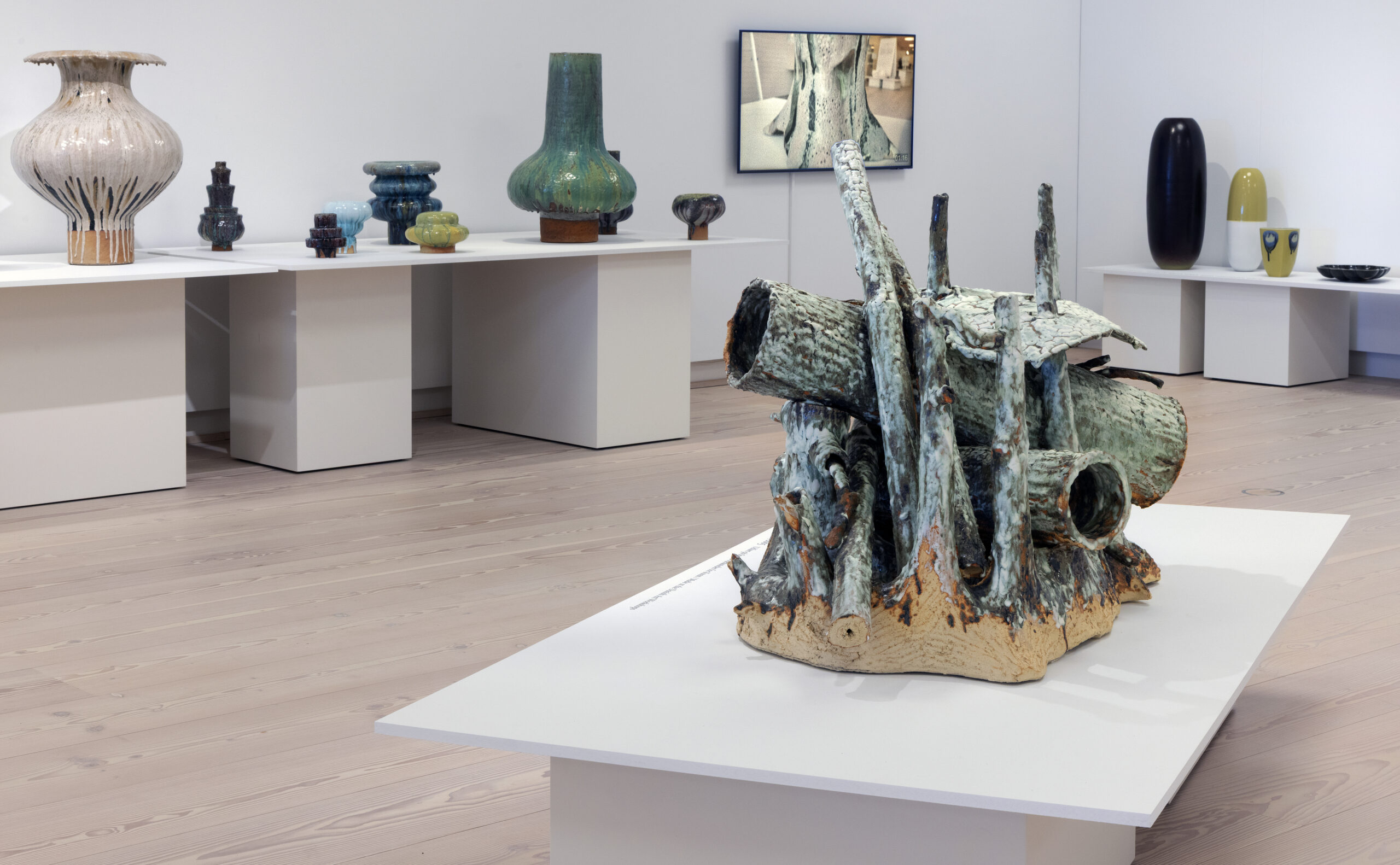 Installationsfoto med skulpturen ”Large Root Green, White #100” i stentøj med glasur i forgrunden. Foto: Ole Akhøj