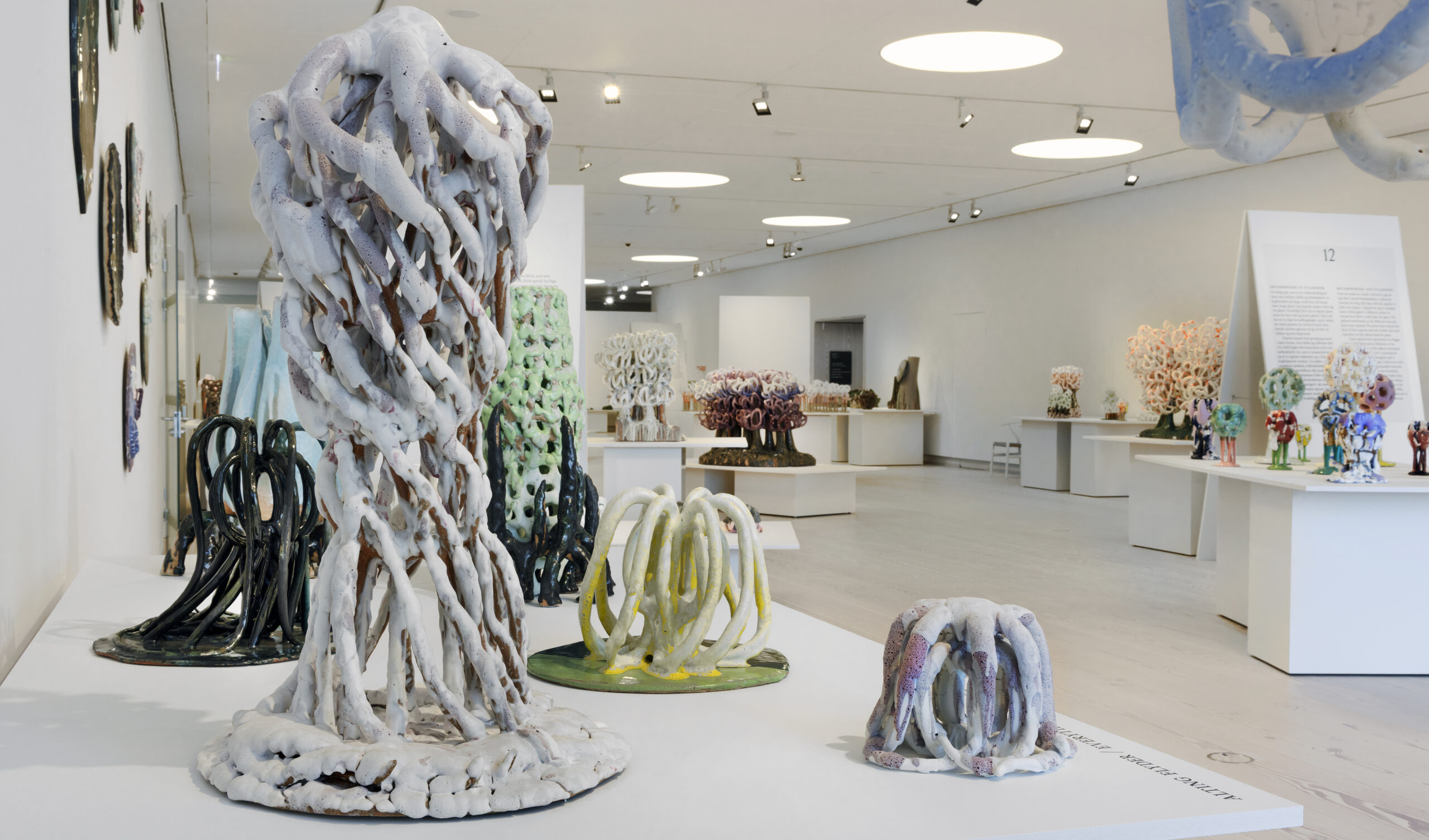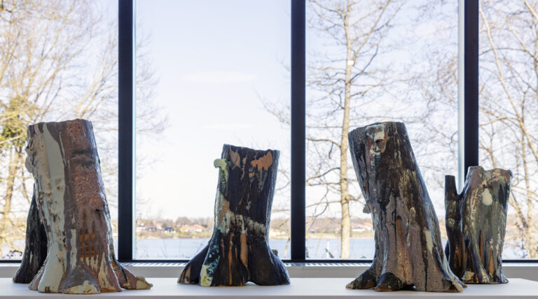 CLAY: Bente Skjøttgaard – Natur og Glasur. Coverfoto: Udstillingsrummet for skiftende udstillinger på Clay udmærker sig ved, at der er åbnet for et view ud over Lillebælt. Her som baggrund til en ny serie ”Family Trees/Stamtræer” af Bente Skjøttgaard. Foto: Ole Akhøj