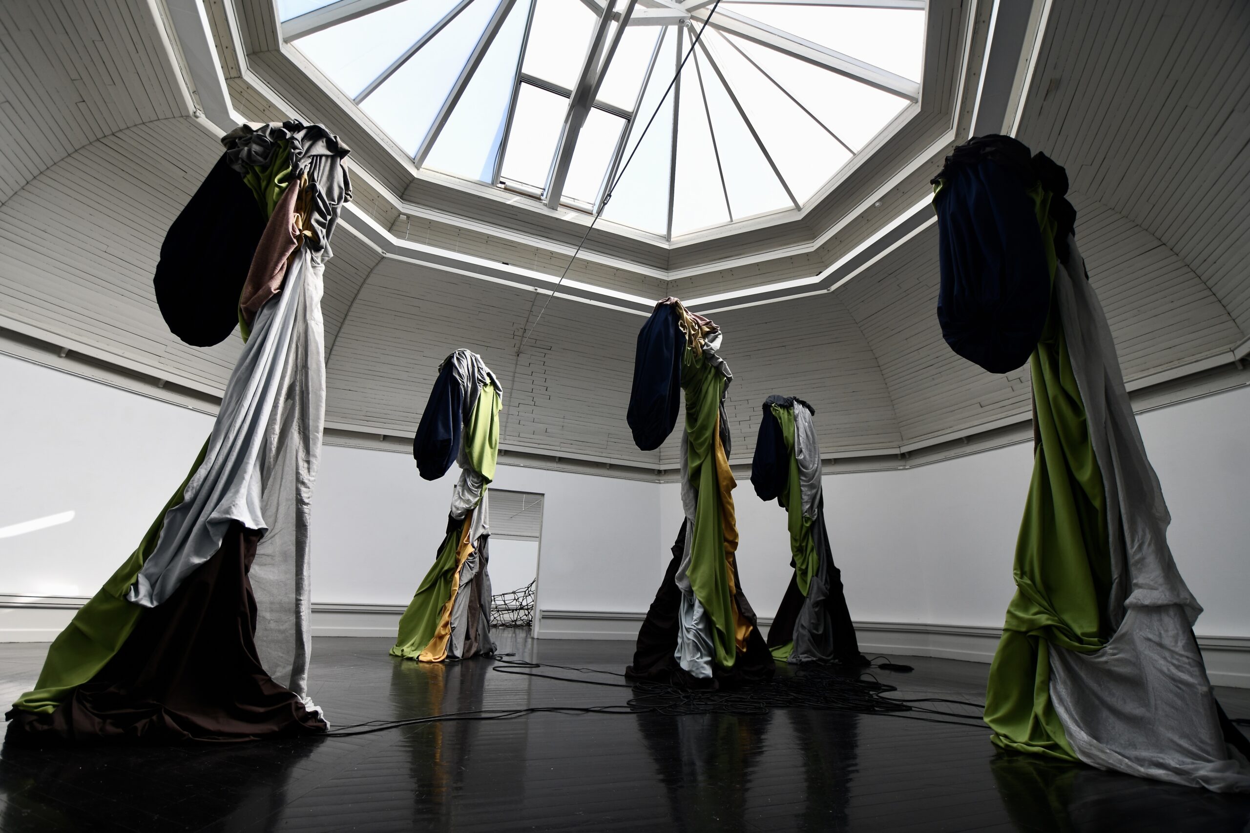 Sandra Mujinga, “Time as a Shield”, 2024, lydinstallation, 43:02 min. (loop), stål, skum, nye og genanvendte tekstiler, højttalere, media player, MDF board, kabler, fem skulpturer: hver måler ca. 415 × 125 × 125 cm. Vokalister: Isabel Crespo, Miriam Elhajli, Amirtha Kidambi, Shara Lunon, Jaswiry Morel, Cleo Reed og Juno Williams. Kæmpeskulpturerne ligner påklædte træer, som tårner sig op mod himlen i bygningens centrale rum. Musikken fanger vores underbevidsthed, som var der tale om et religiøst ritual. Foto: Niels Lyksted.