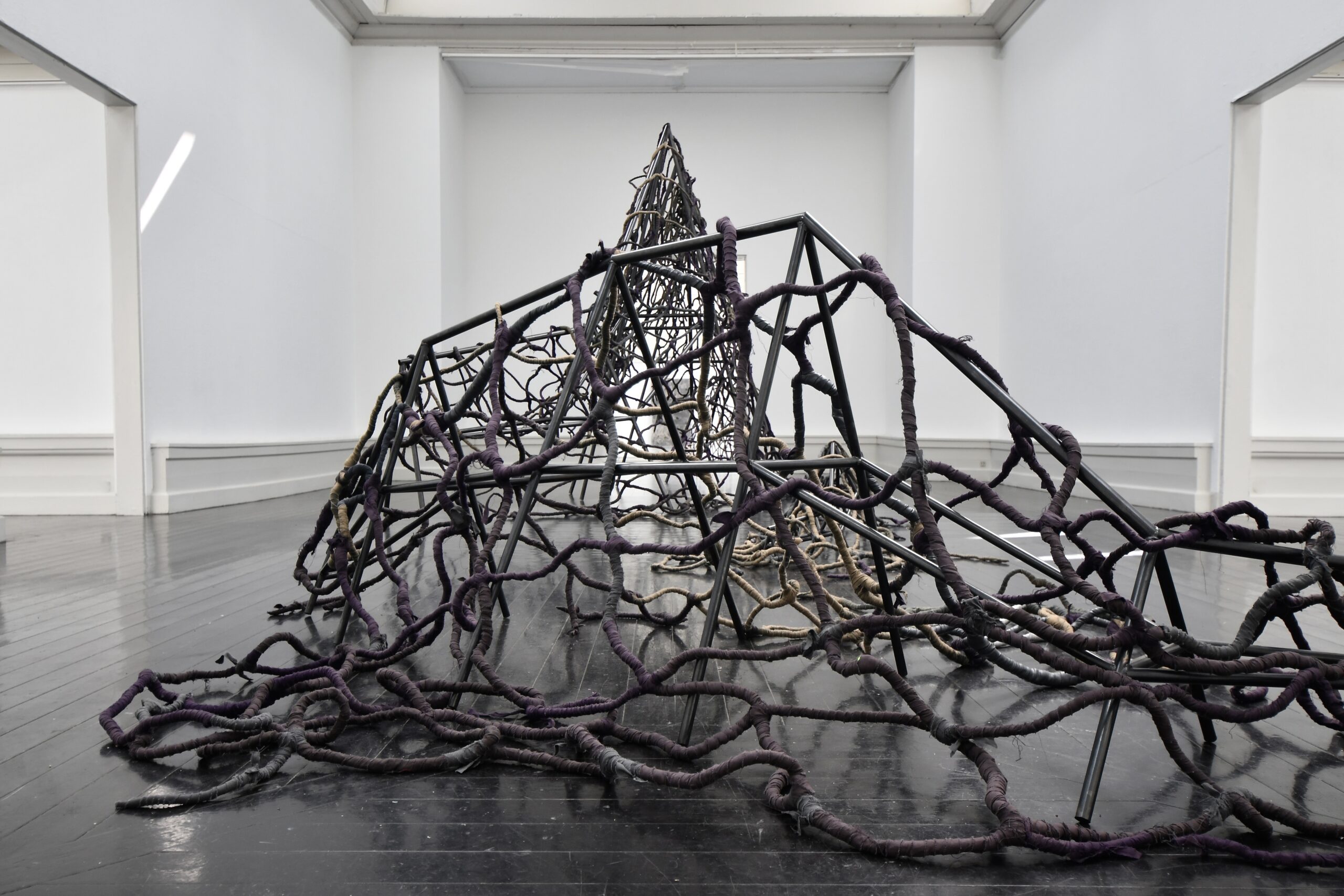 And My Body Carried All of You, 2024, stål, stof, tråd, tre skulpturer, hver: 2.09 × 3.5 × 6.8 m. De tre spøgelsesagtige former synes at svæve eller svømme over beskueren gennem rummet. De illuderer fossiler af abstrakte forhistoriske dyr. Deres “skeletter” er konstrueret af industrielle stålstænger, mens “huden” består af stofbaner flettet sammen i store mønstre, hvor forfald og genopbygning krydser hinanden. Foto: Niels Lyksted.