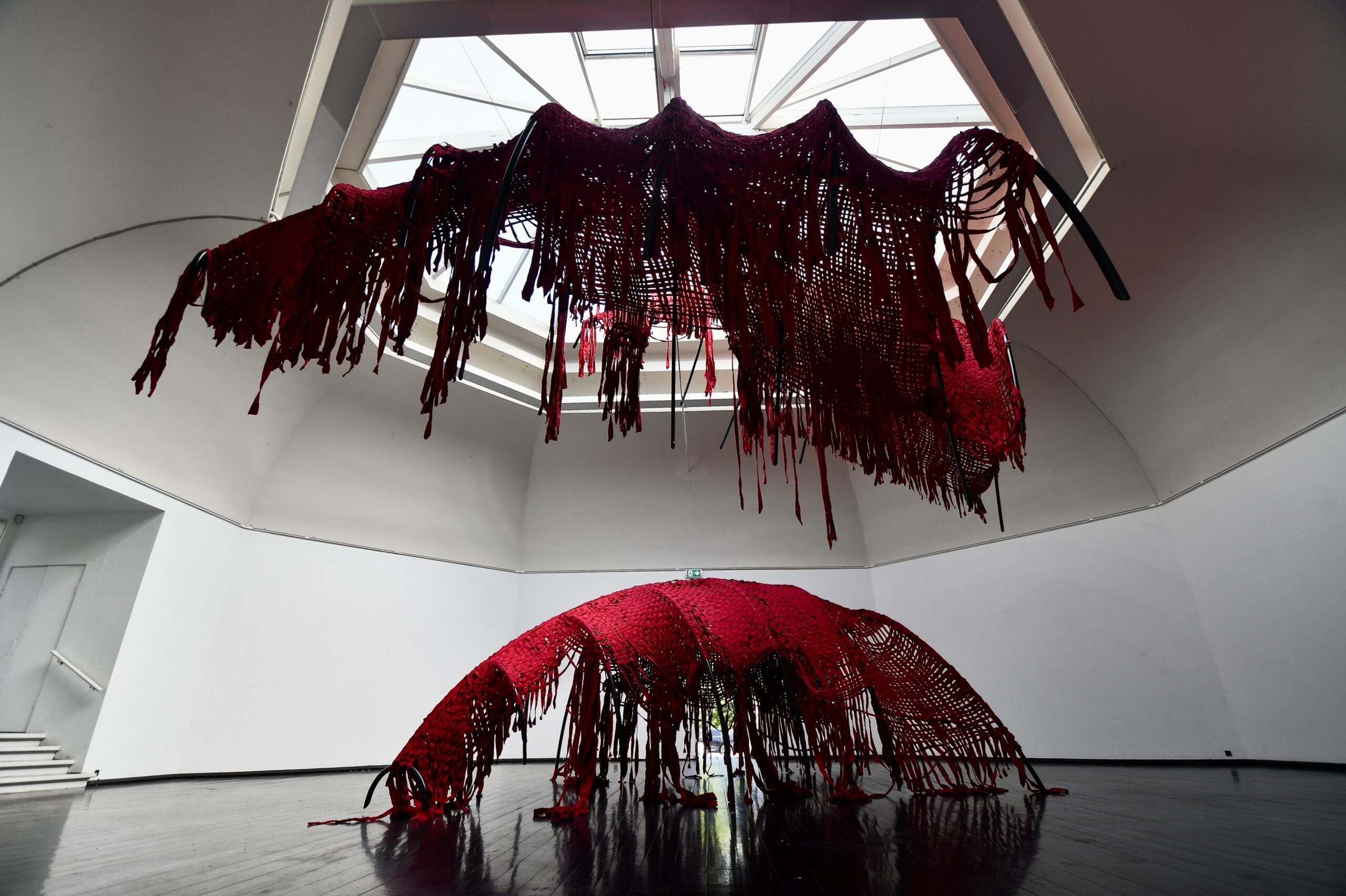 Mujingas bidrag var en syv meter høj rød skulptur “Ghosting”, 2019, der formåede at skabe fascination og frygt på samme tid. Konceptet går iøvrigt igen i den nye skulptur “And My Body Carried All of You”, 2024, der netop nu vises på Den Frie. Denne skulptur er ganske vist tredelt, men lige så høj – og mindst lige så foruroligende!
