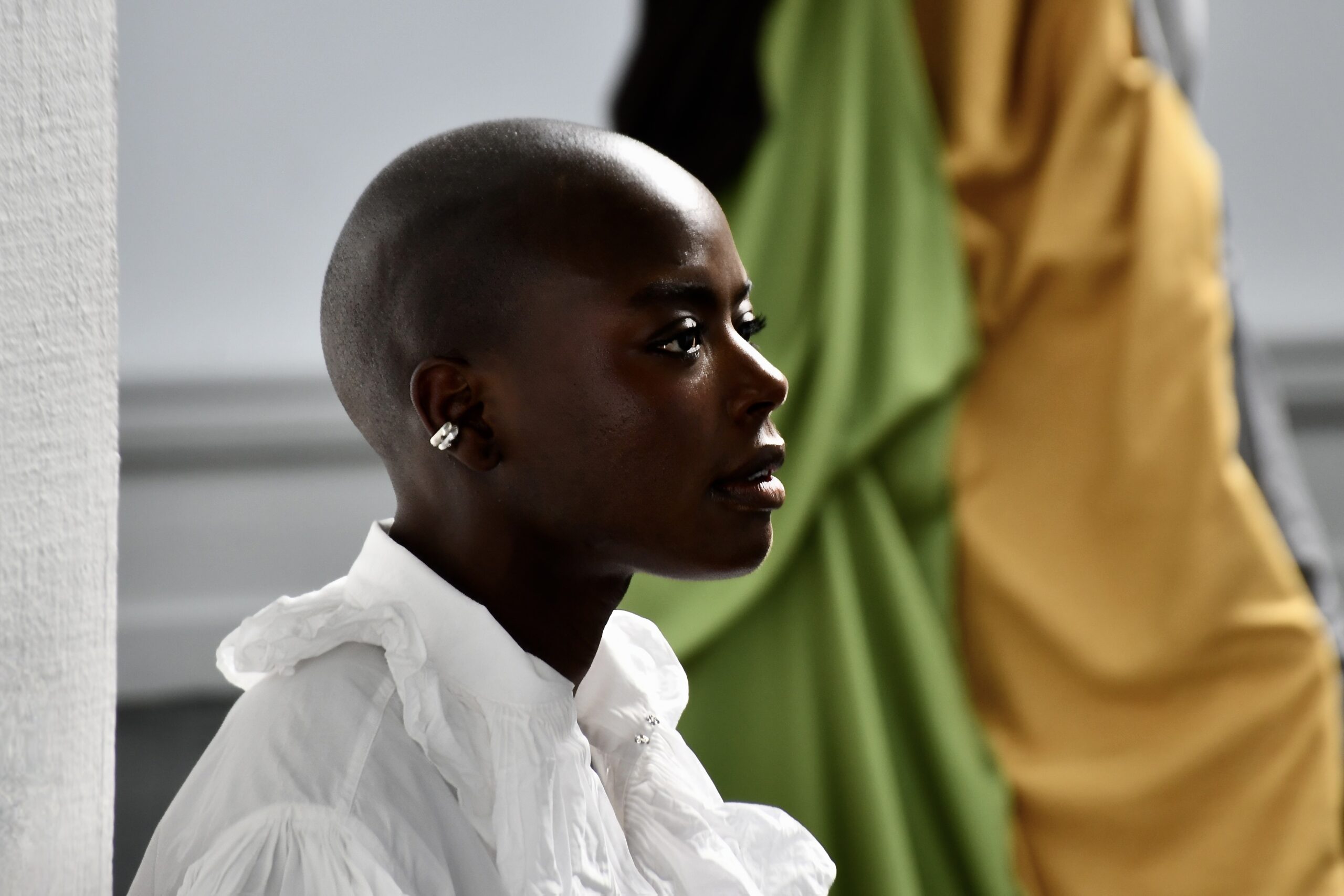 Portræt af den congolesisk/norske kunstner og musiker Sandra Mujinga ved ferniseringen af udstillingen “Sløjfe” i Den Frie. Foto: Niels Lyksted.