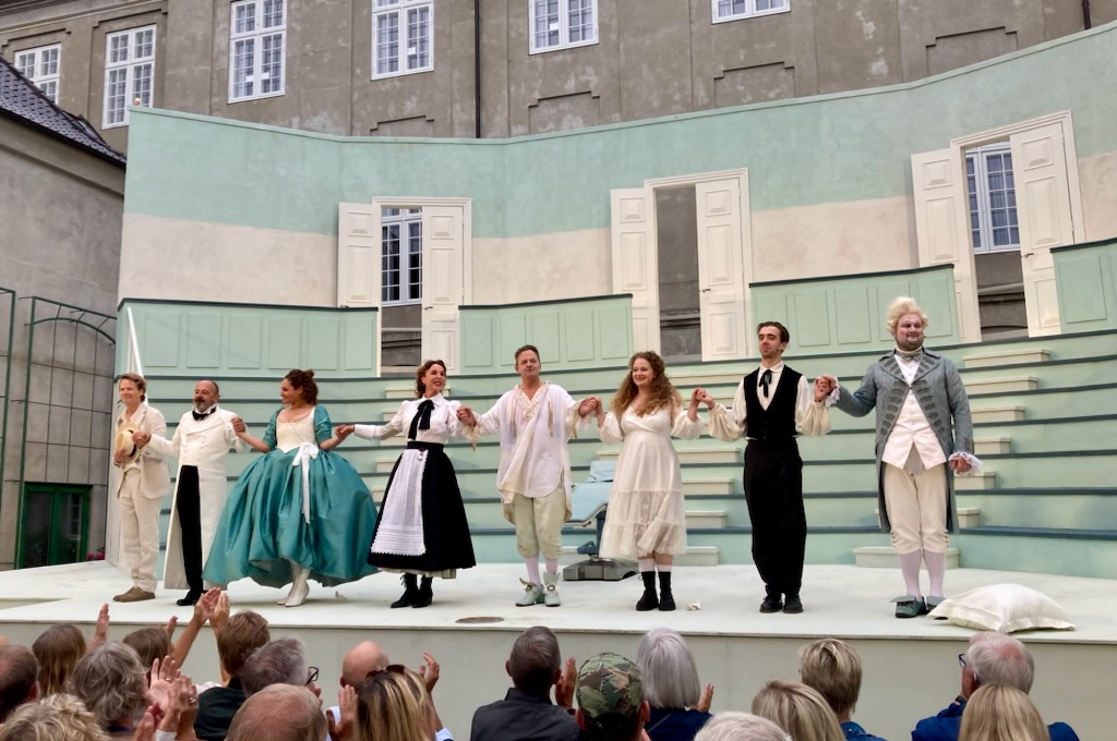 Grønnegårds Teatret har gjort det igen. De tør tage chancer, her taler jeg om vejret, og viderefører en gammel teatertradition i Danmark med at spille teater udendørs. Imponerende og det er deres produktion af ’Den indbildt syge’ også. Scenografien af Laura Løwe passer fint i Odd Fellow Palæets Haves regi. Den er holdt stram i smukke sarte nuancer, med mange finurlige gemmesteder. Charlotte Munksø har en sikker hånd i sin instruktion. Der er et fint greb mellem den stejle trappe, som dominerer scenen og skuespillerne, som får udnyttet det svære, men spændende scenerum. Laura Løwes kostumemæssige løsning i forestillingen er genial. Med et spænd på 300 år er skuespillerne klædt i kostumer som dækker hele perioden. De bliver en helhed og det varer længe før du opdager det. Flot.