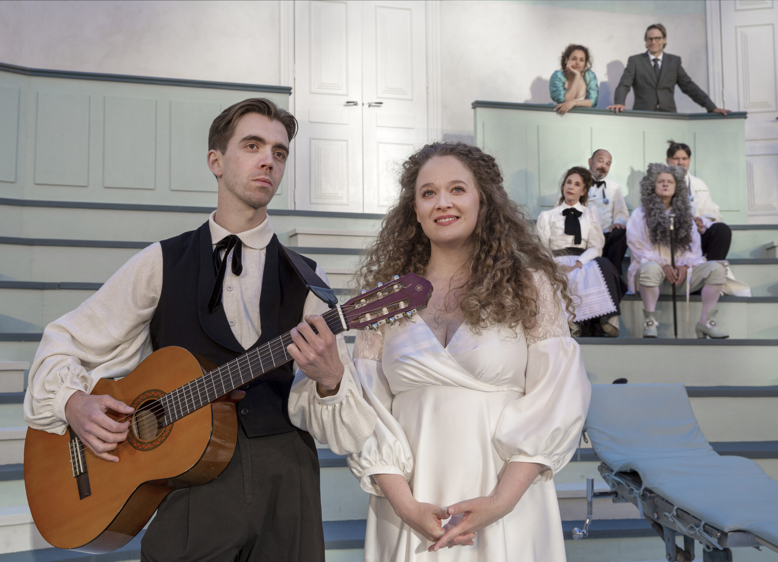 Men datteren har helt andre planer og vil giftes med en ung musikant Cléante (Tryggvi Sæberg Björnsson). Far, Steen Stig Lommer, og søn prøver nu i skøn forening at overbevise Angelique om, at ægteskabet er det rigtige. Uanset hvor meget Thomas (Nicolai Jørgensen), prøver med fine ord og tilnærmelser, duer det ikke. Nicolai Jørgensen tilfører figuren en ekstra dimension. Ikke alene er han humoristisk, han er mere end morsom, og fremstår som en kikset og overdreven uduelig dumrian, der bruger fine ord uden indhold. Smukt sekunderet af faren.
