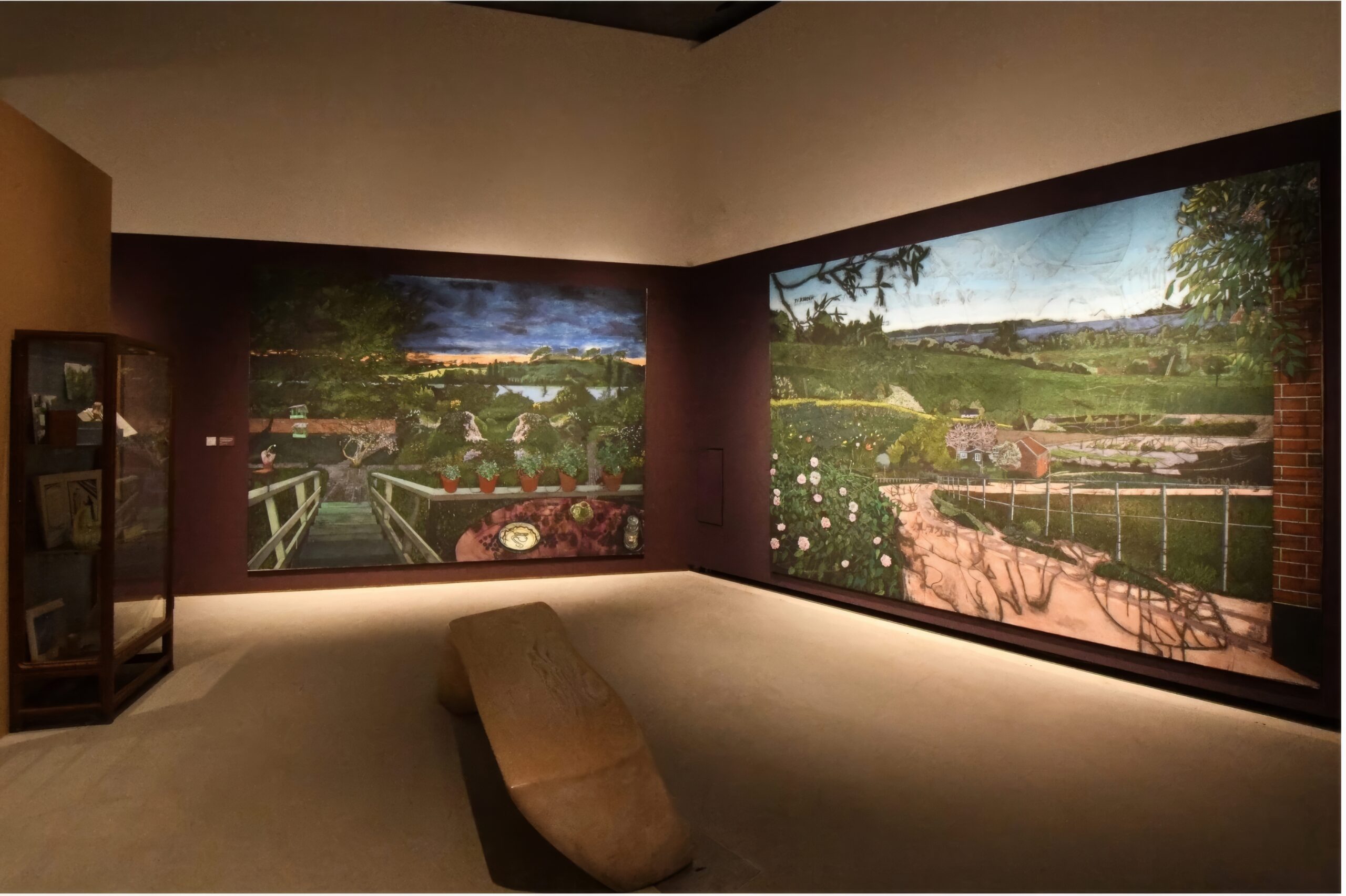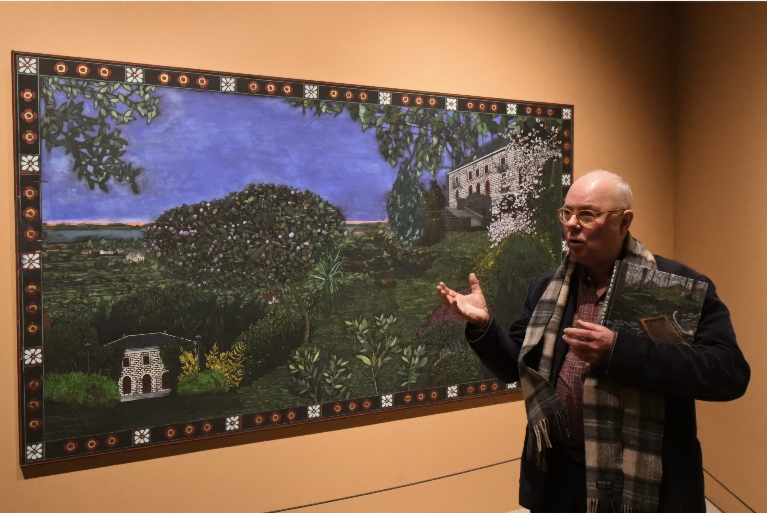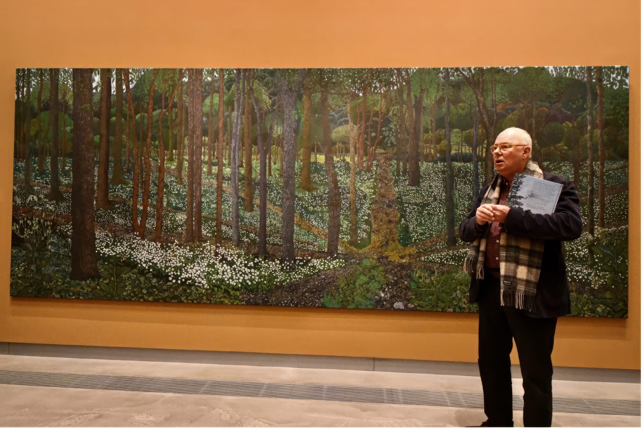 “Ottevejskrogen”, 2021-22. Gesso og akryl på lærred, 190 x 490 cm. Sådan ser Ottevejskrogen ikke ud i dag. Jesper Christiansen har indsat træer malet af andre kunstnere bl.a. af Lucian Freud (elmetræ tv) og Oluf Rude (egetræ th bag Jesper Christiansen). Foto: © Niels Lyksted – all rights reserved
