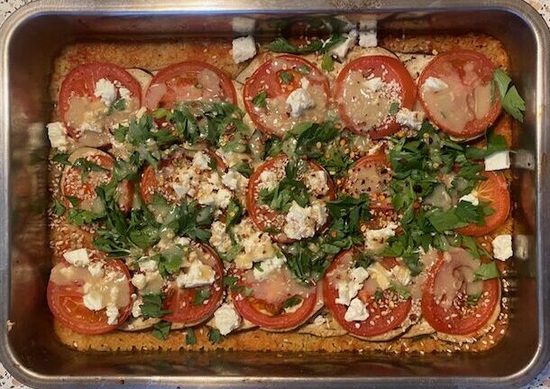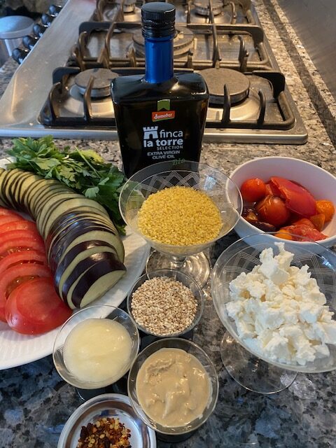 Tag bulgur og hæld op i et fad med mosede tomater, hæld lidt kogende vand over. Krydr med salt og peber. Skær aubergine og friske tomater i skiver og læg dem pænt i lag ovenpå. Dryp lidt olie over og lidt ekstra salt og peber. Ind i ovnen 15-20 minutter. Ud med fadet og smuldr fetaost over, ind igen i 5-10 minutter. Drys sesam over de sidste par minutter. Tag ’yndigheden’ ud og kom lidt honning og tahin over, samt chili og bredbladet persille. Kan spises som hovedret med salat og brød eller med kød.