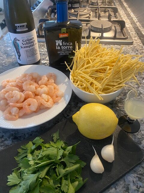 Skær 3-4 fed hvidløg i tynde skiver og svits dem på en pande i smør. Kom frisk pasta, enten hjemmelavet eller fra supermarkedet, ikke tørt, på panden og vend det med hvidløg et par minutter. Kom gerne lidt ekstra smør på, det må ikke blive brunt. Tilsæt citronsaft og pillede halvstore rejer. Dem fra frost er fine, optøede. Hæld et stort glas hvidvin ved og lidt vand eller du kan nøjes med vand. Lad det hele simre til pastaen er al dente og rejerne tilberedte. Kom til sidst ekstra citron over retten og top med persille.