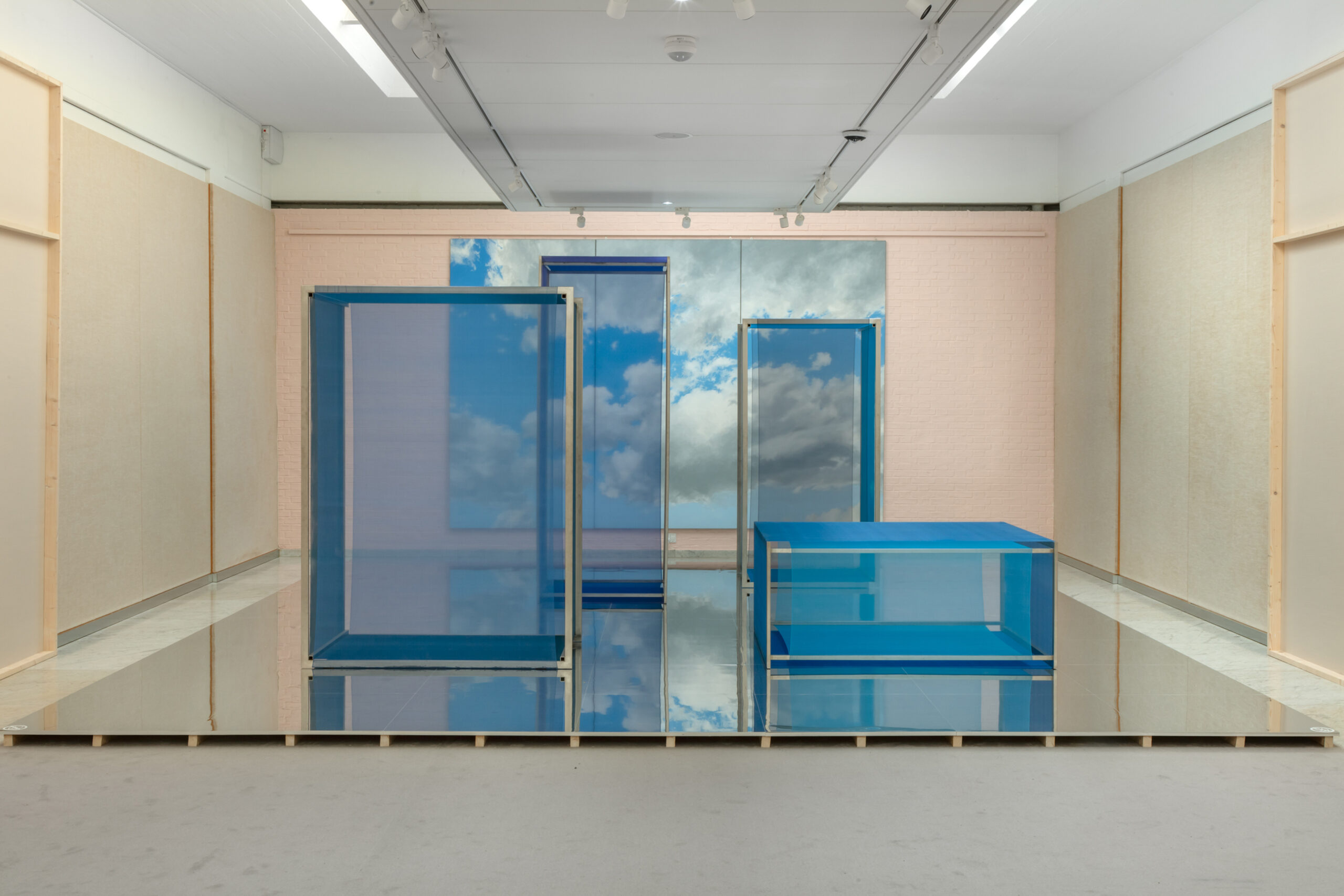 ”Hvis du kan se det jeg ser”: Tove Storchs blændende installation med et maleri af Geoffrey Hendricks’ skyformationer som baggrund. Foto: Niels Fabeæk
