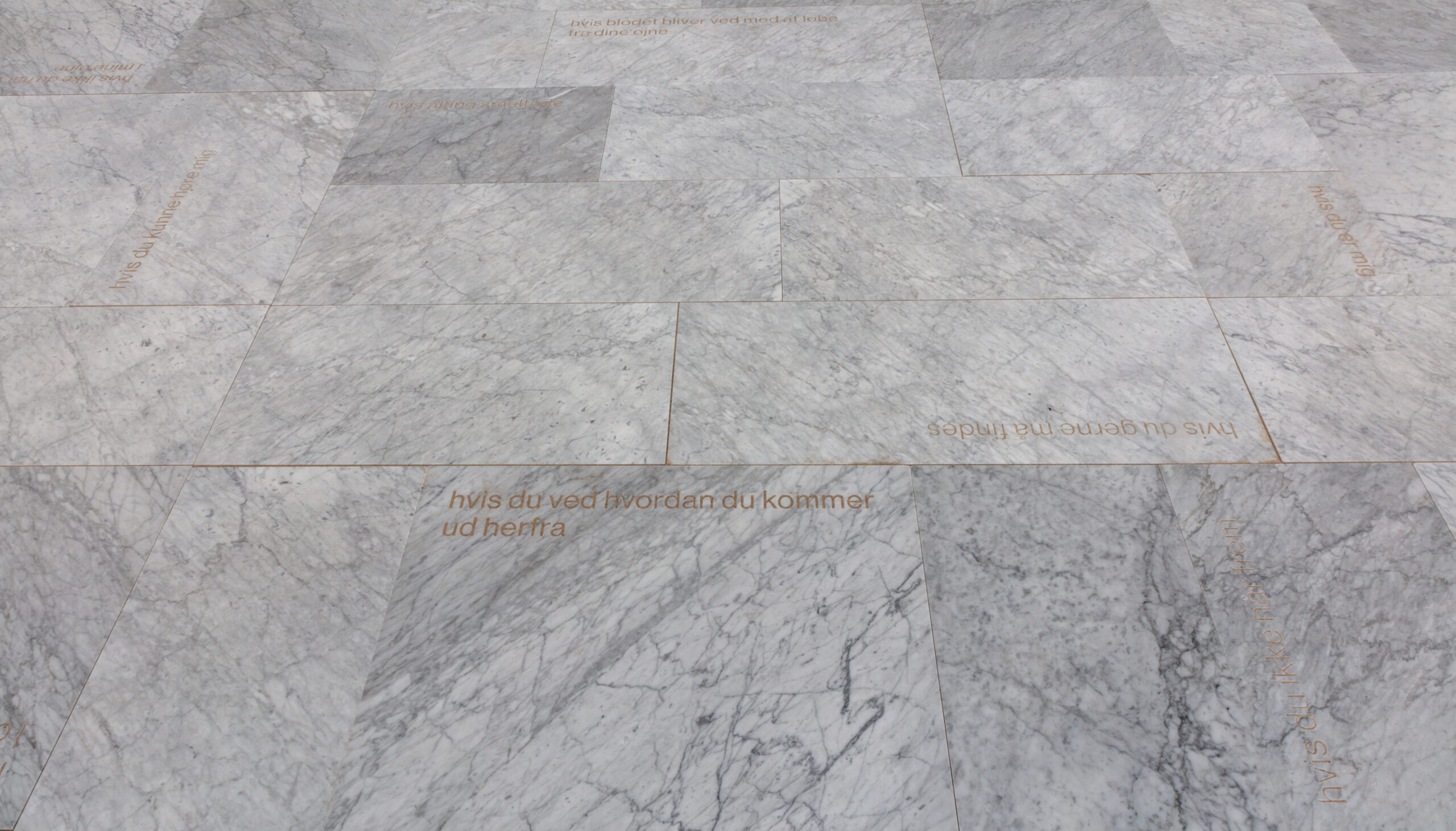 ”Hvis du kan se det jeg ser”: I Morten Søndergaards værk består af marmorfliser med diverse iagttagelser indgraveret som ord og sætninger, som kunne optræde i en digtsamling eller blot beskrivelser af hverdagen. Foto: Niels Fabæk