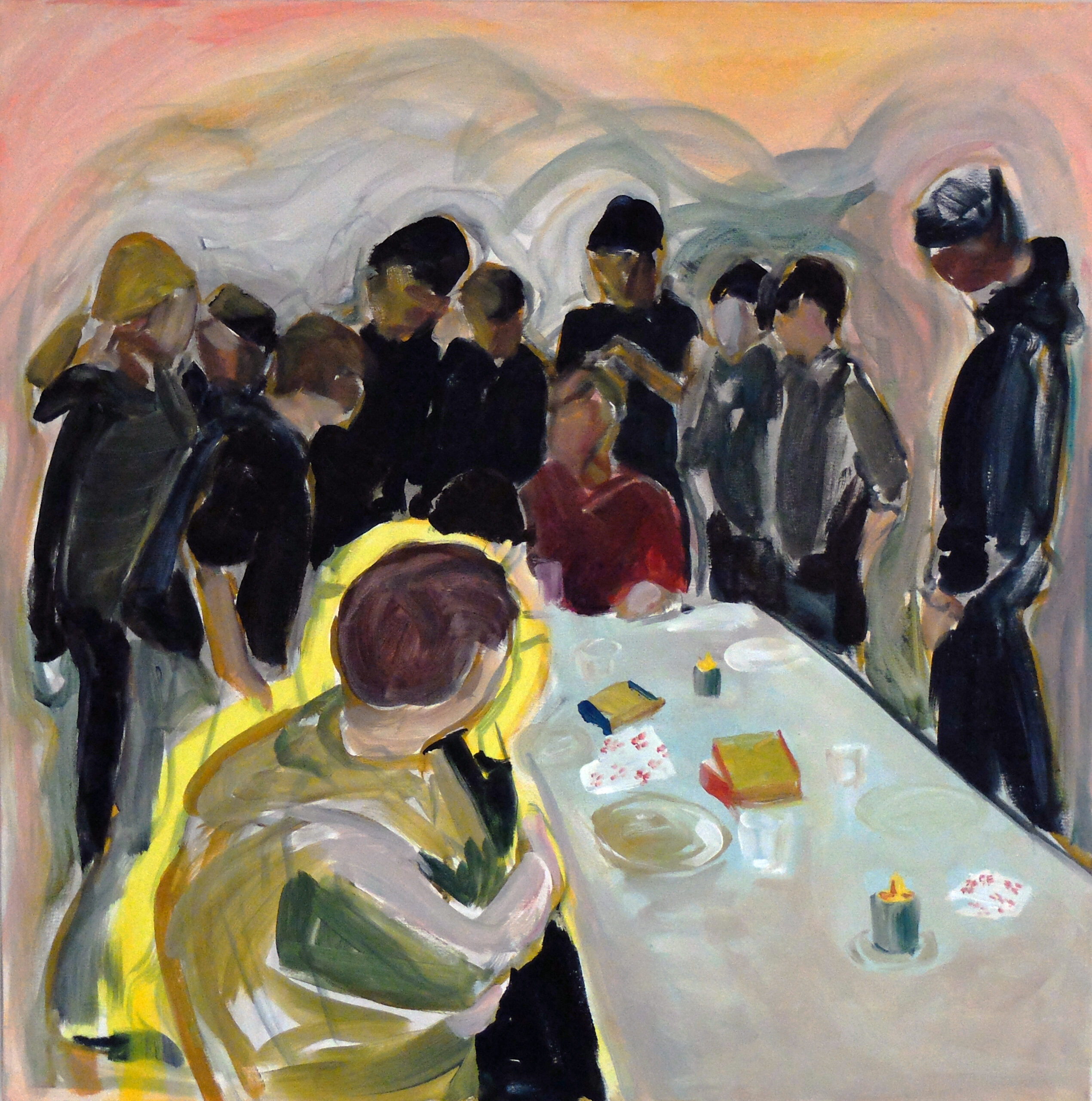 Alice Vestergaards akrylmalerier får værkernes figurer til at træde frem i et dramatisk skær som her i maleriet ”Drengefødselsdagen. Foto: Lars Svanholm