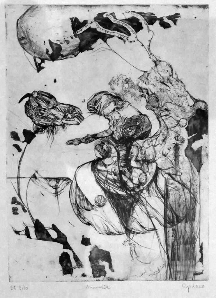 Grafik er bestemt heller ikke overrepræsenteret på KP25, men når genren til gengæld er til stede, kan man glæde sig over tre fremragende grafiske arbejder af Anneline Schjødt Pedersen, som gennem de senere år har markeret sig stærkt blandt andet på flere censurerede udstillinger. Hun benytter sig af stregætsning, akvatinte med syrelavering og fladbidning samt koldnålsradering.