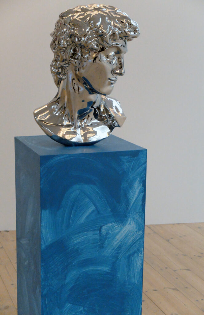 En syret version af et klassisk portræt af Eske Touborg, der lever sit eget højglanspolerede liv på en høj, blå sokkel.