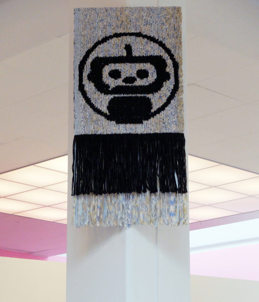 Et tekstilværk opleves som et tæppe med et emoji-lignende motiv, men i udstillingskataloget kan man læse,at værket af