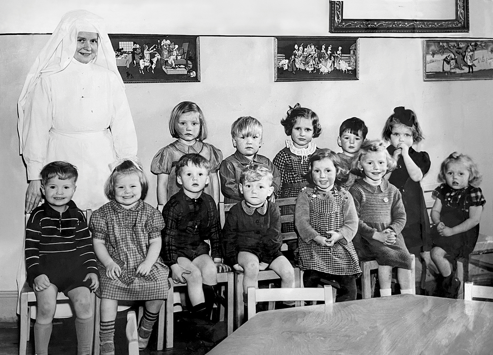 MARTIN SUNDSTRØM KATASTROFEN PÅ DEN FRANSKE SKOLE, GADS FORLAG. (Annette Hansen). Sr. Edith i hvide nonneklæder med børnehaveklasse.