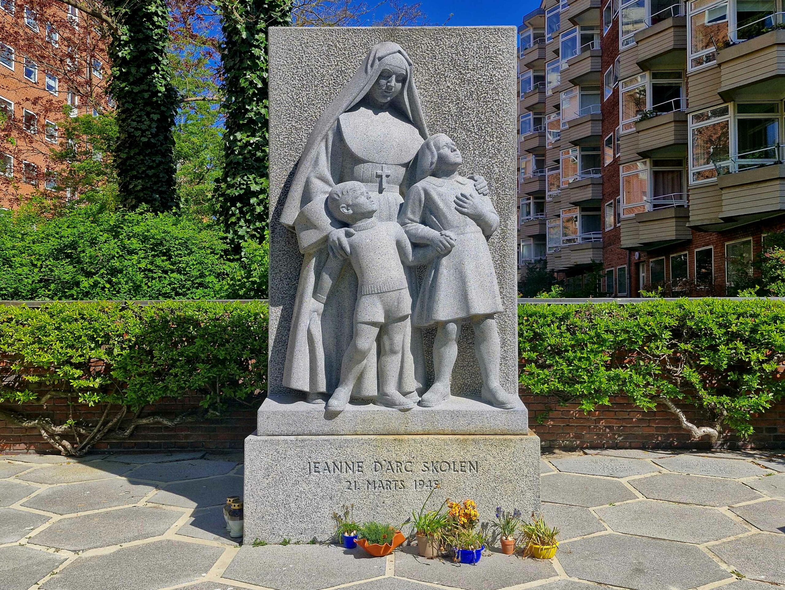 Foto: Githa Schultz april 2025: Monumentet, hvor Den Franske Skole på Frederiksberg Allé, lå, skabt af kunstneren Max Andersen i 1953. Monumentet er et mindesmærke, hvor sr. Edith er nonnen, der skærmer børn mod katastrofe, og minder os alle om styrke, kærlighed og mod i den værst tænkelige situation