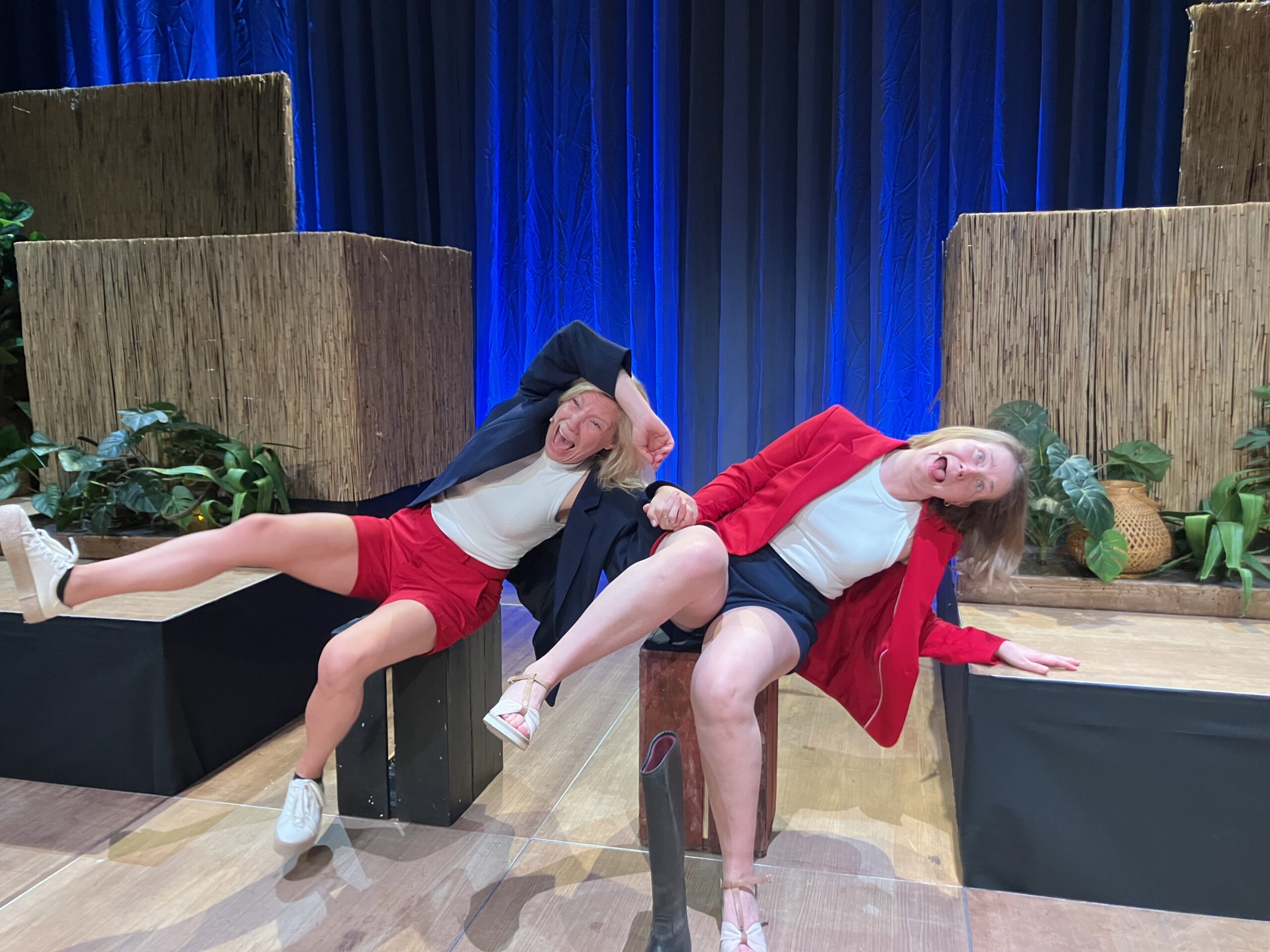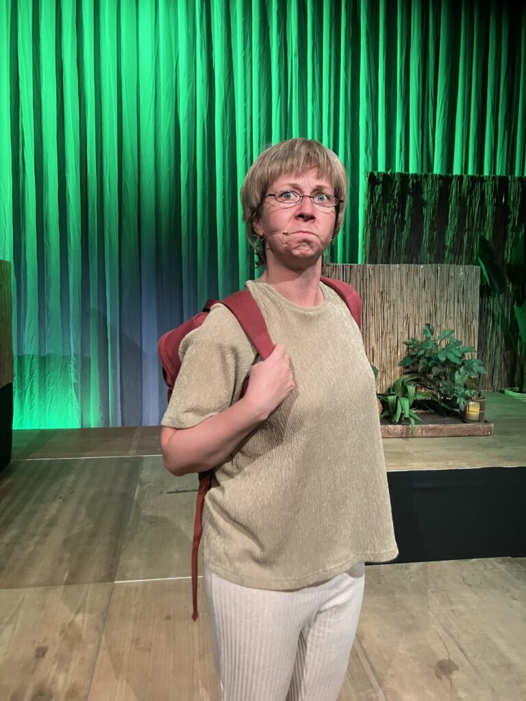 Katrine Skjoldelev bliver i revyen betegnet som altmuligperson og 2. stemmesangerinde. Katrine er et fint supplement til de andre medvirkende.