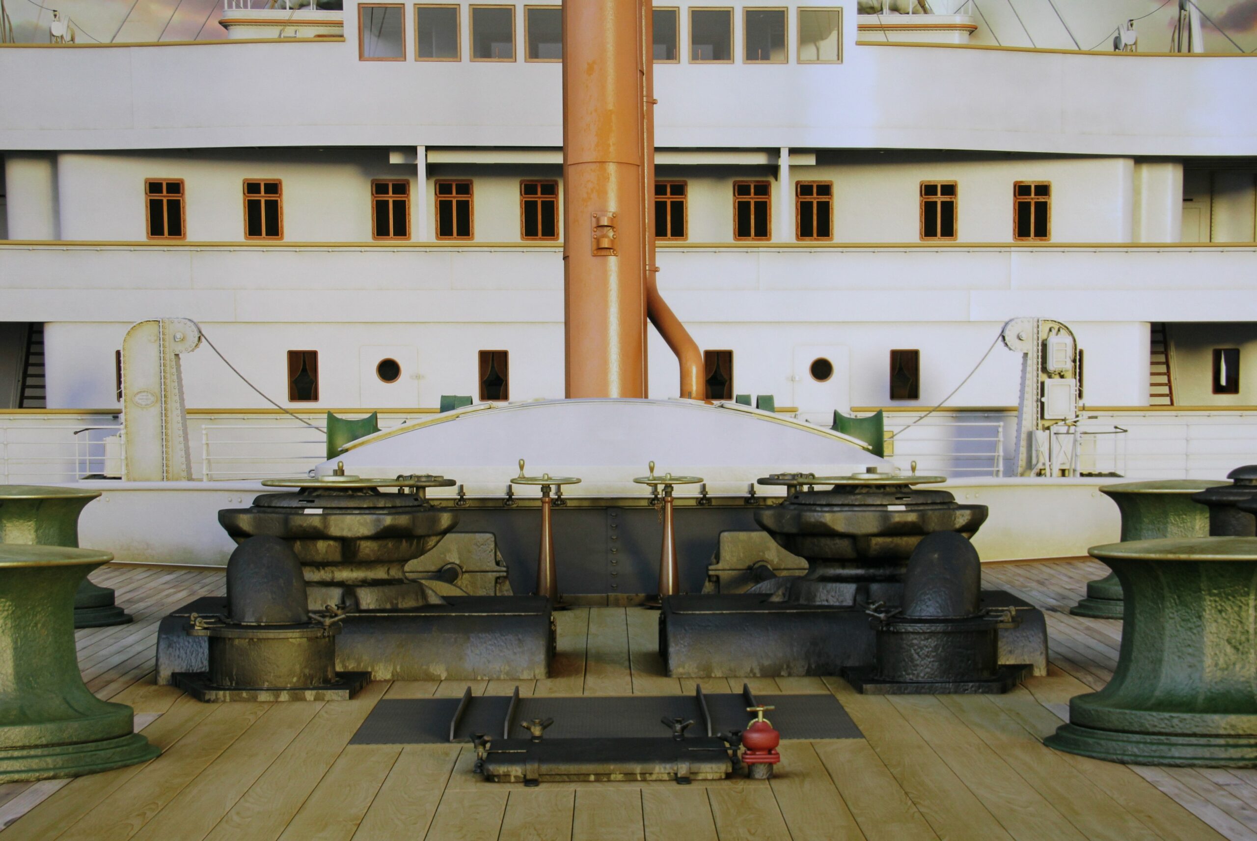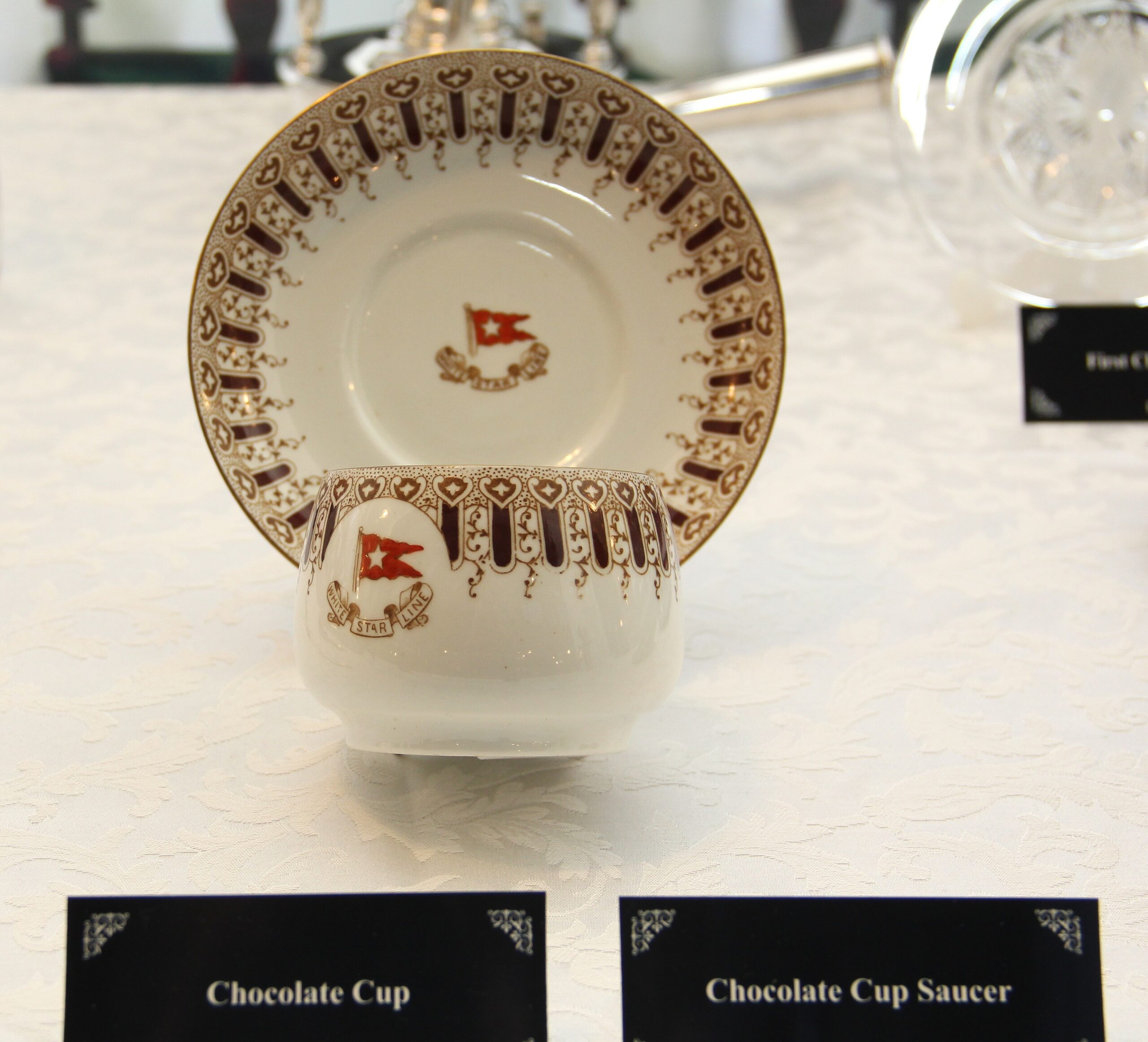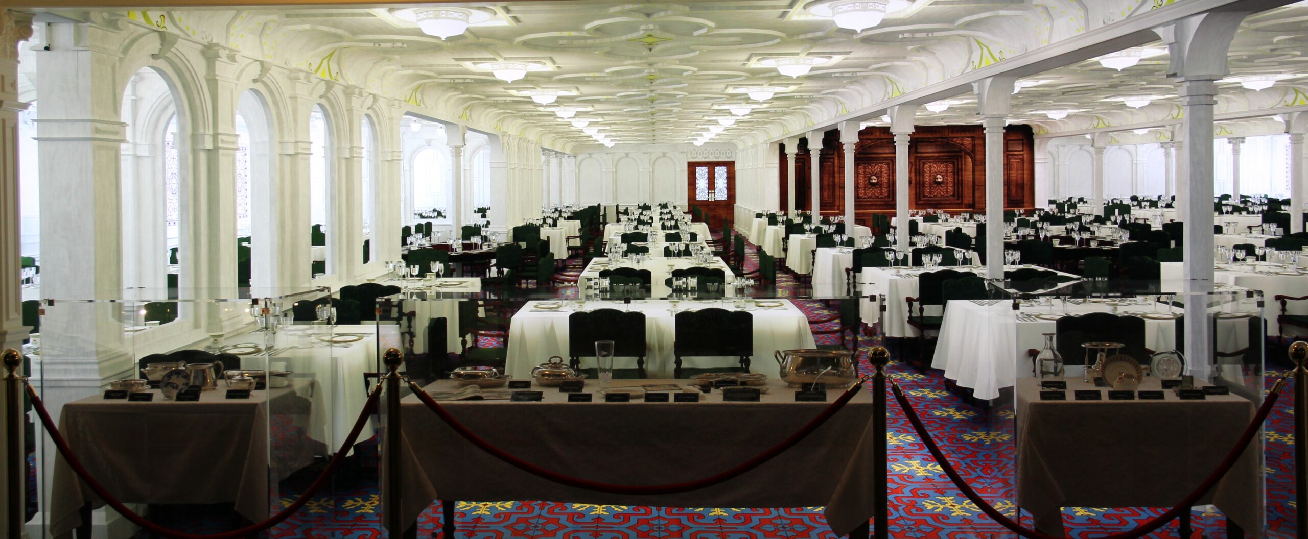 Så skal vi ombord på skibet. Via en landgangsbro kommer du ind i skibet. Det var besynderligt at blive overrumplet af denne mærkelige fornemmelse af forventning, fordi jeg var spændt på at se resten af udstillingen, og så også denne lidt uhyggelige stemning der greb mig, fordi man jo ved hvad der efterfølgende skete. Nå, men jeg gik frejdigt ombord og kom ind i den legendariske hall med den store trappe. Intet mindre end imponerende. En kæmpe fotostat med skibets eksklusive restaurant, pryder endevæggen, og foran er sølvtøj og andre genstande opstillet, man har benyttet i restauranten. Rederiet var meget bevidst om at give alle passagerer, uanset hvilken klasse de rejste på, en uforglemmelig rejse, for maden var en afgørende faktor for hvilket rederi, man ville vælge at rejse med. Derfor blev maden, også til tredje klasses passagererne, fabrikeret i det centrale køkken. Selvfølgelig var der forskel, men standarden var meget høj.