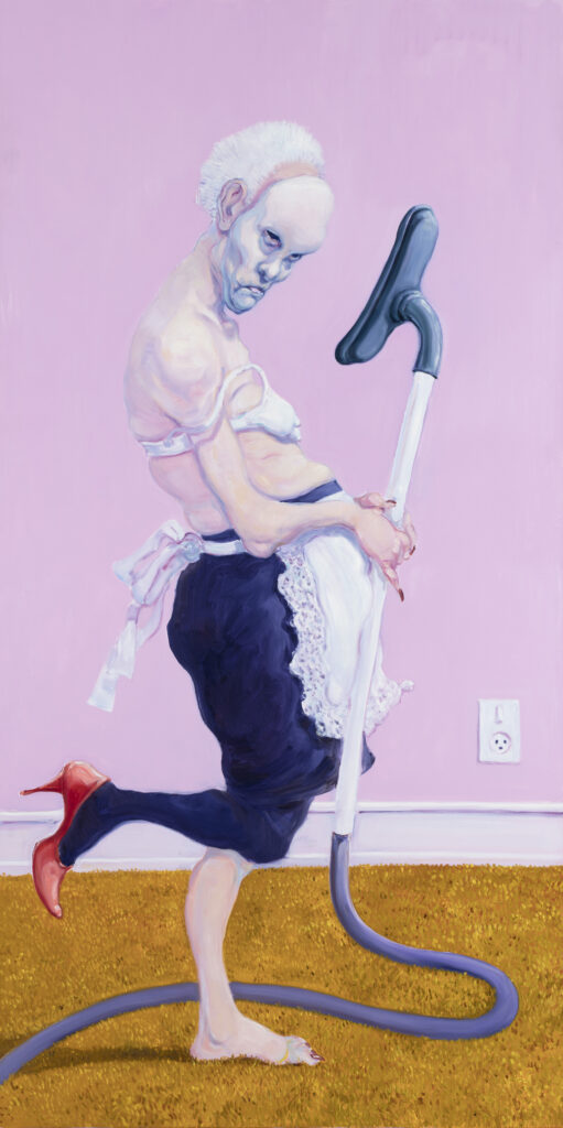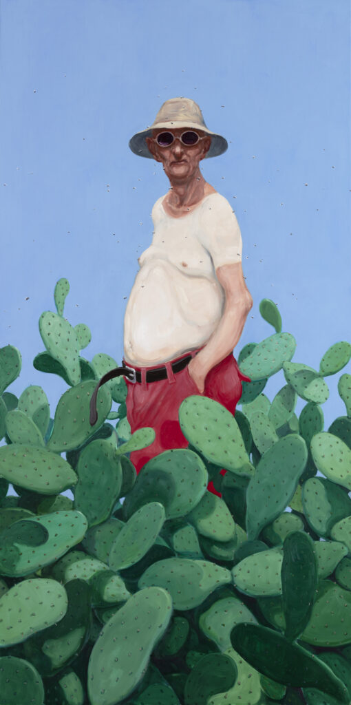 Og lige netop nøgne kroppe kan du også få at se på Trapholt i denne omgang. Kvium har en forkærlighed for ”naturlige” kroppe, hvor tyngdeloven træder i kraft. Hvis Kviums nøgne kroppe var inviteret hjem i min stue, så ville jeg bede dem om at dække sig til, imens vi talte sammen. Men værket: ”Turisten” fra 2017 ligner et selvportræt, ligesom mange af de andre malerier. Jeg ser en far/ bedstefar i værket ”Turisten”, som giver mig en følelse af noget genkendeligt og varmt.